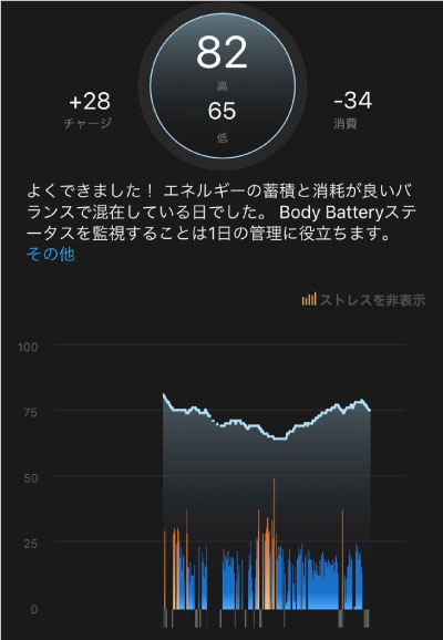 導入することで分かったことが、朝からBodyBatteryが低いこと。一日中低いままのことが多く、その数値を見ることでなぜ低いままなのかを考えました。