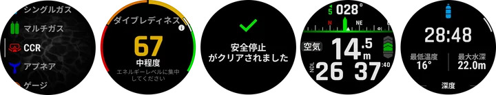 左から、ダイブモード選択、ダイブレディネス、ダイブアラート、水中電子コンパス、ダイブログ