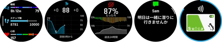 左から、ライフログBody Battery、血中酸素トラッキング、通知機能、Suica