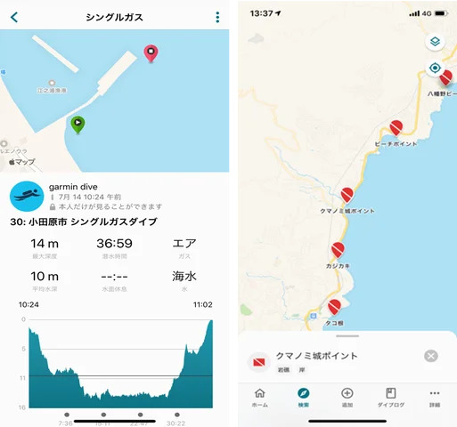 アプリを「Descent」とペアリングすると、潜水記録を自動的に同期してアップロードします。エントリー地点、エキジット地点や、最大・平均水深、水深変化のタイムライン、詳細データの確認が可能です。