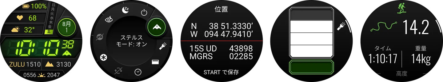 左から、AMOLEDモデルのウォッチフェイス、ステルスモード、デュアルポジションフォーマット、LEDフラッシュライト、ラッキングアクティビティ