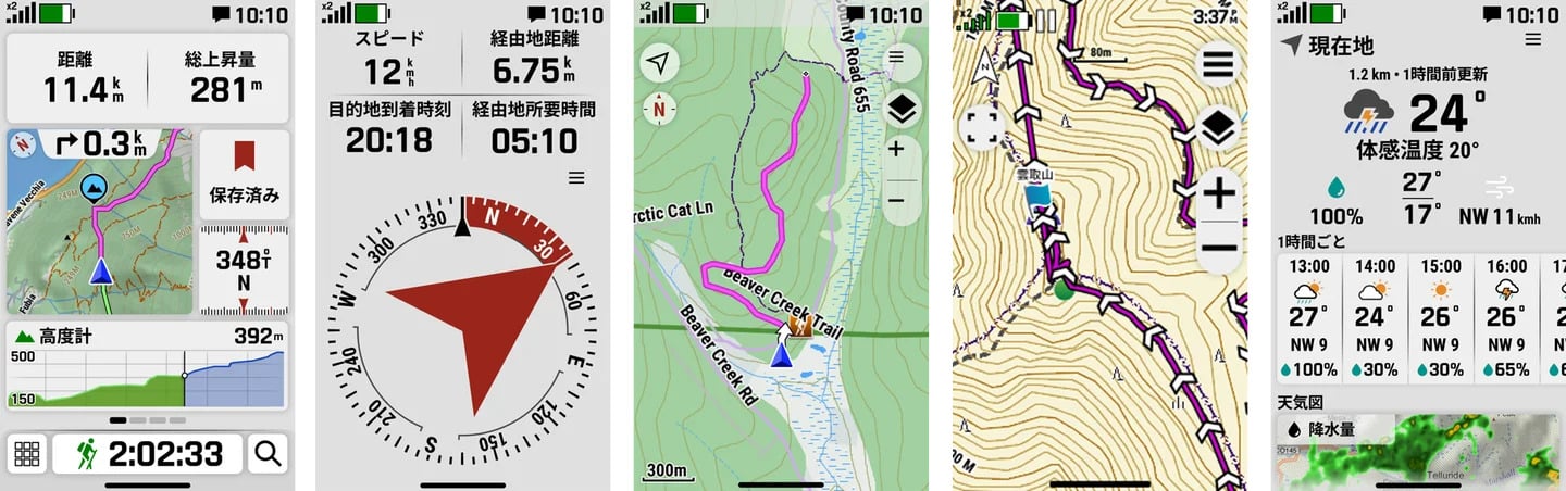 リアルタイムの天気情報を取得やコース入力による地図掲載、ルート作成、ナビゲート機能と移動記録を保存が可能です。