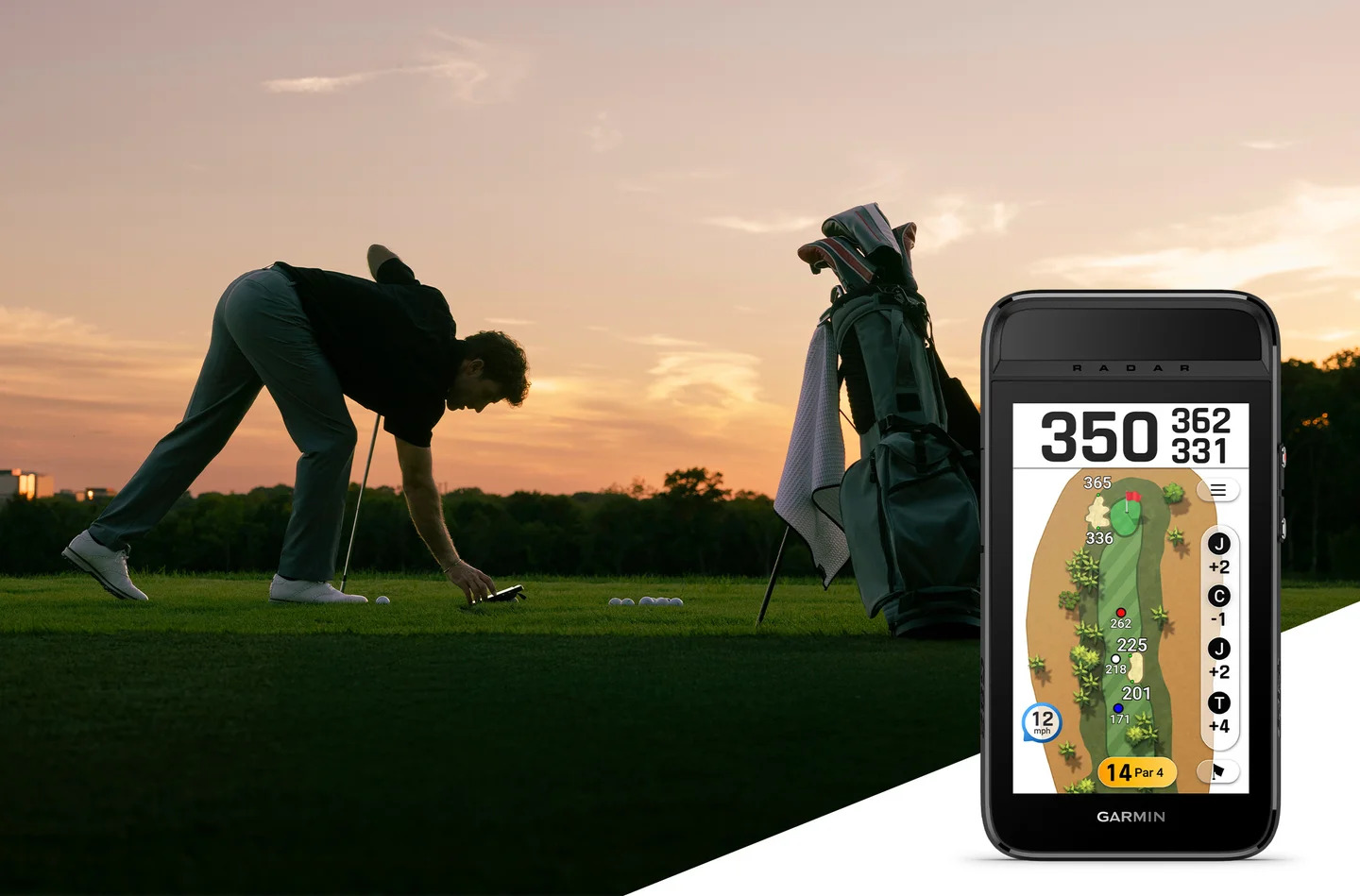 コースの標高差だけでなく風速/風向き、空気密度を考慮し、グリーンまでの実際に打つべき推奨距離を表示します。 (風速/風向き、空気密度の考慮にはGarmin Golf アプリとのペアリングが必要) |