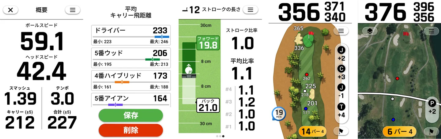 左から、スイング計測、クラブマッピング、パッティングトレーニング、ゴルフナビ画面、航空写真表示