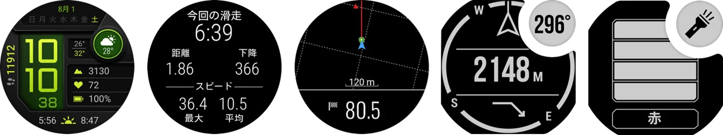 左から、AMOLEDモデルのウォッチフェイス、スキー、ナビゲーション、Dual Powerモデルの電子コンパス、フラッシュライト