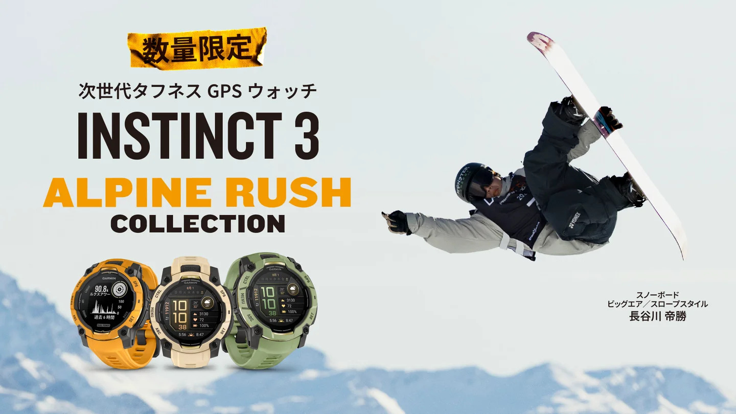 「Instinct 3」シリーズ 数量限定モデル「Alpine Rushコレクション」。Garminアンバサダーでありスノーボーダーの長谷川帝勝選手をメインビジュアルに起用。『Instinct 3』の特徴