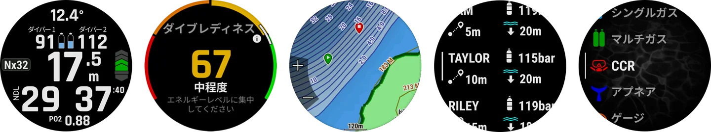 左から、デカ文字モード、ダイブレディネス、ダイブビューマップ、ダイバーポジション、ダイブアクティビティ